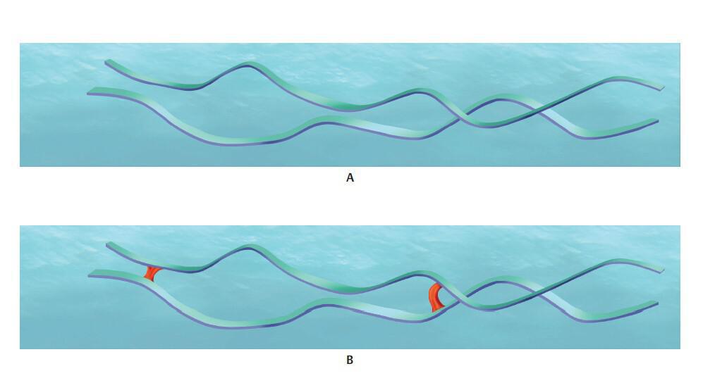 A. Ácido hialurónico no reticulado (HA). Cuando se disuelve en agua, está en forma líquida. B. La reticulación de las moléculas de HA mejora sus propiedades mecánicas, creando un gel con una estructura más firme capaz de resistir la degradación.