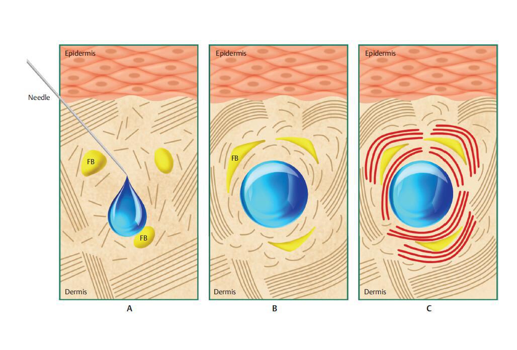 La inyección de HA reticulado en la dermis estimula la producción de colágeno tipo I por el estiramiento mecánico de la dermis, que luego conducía a la activación de los fibroblastos.